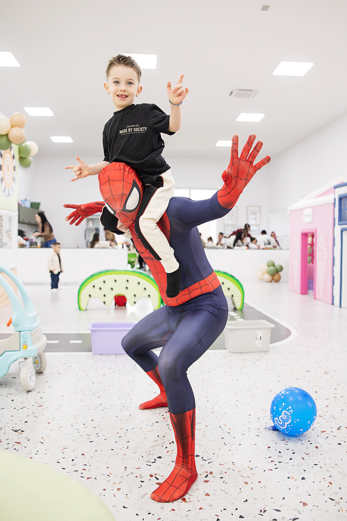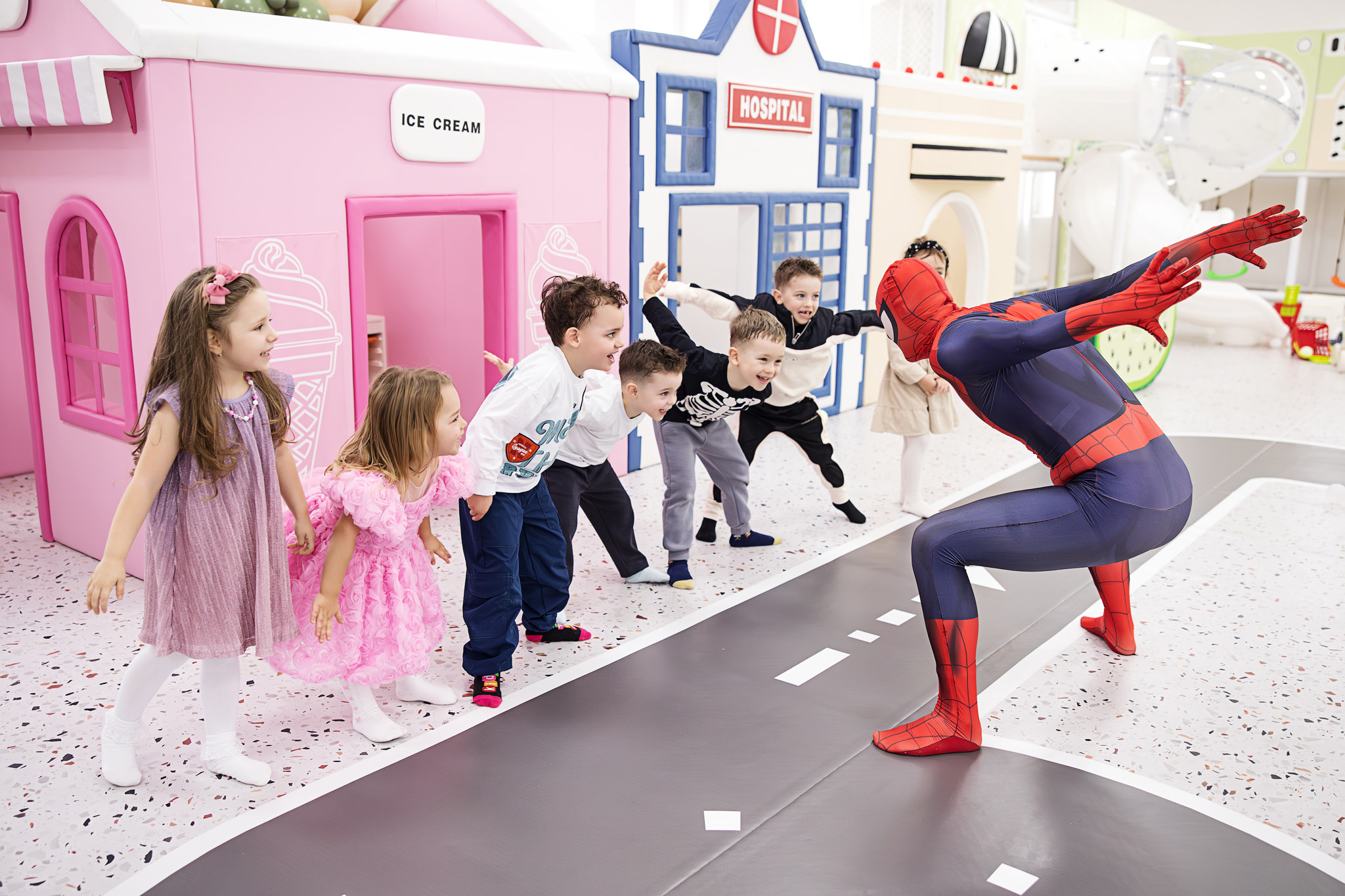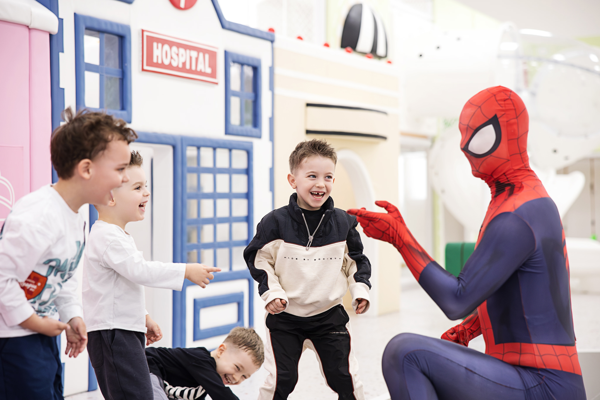 Animatorul Puiu Dan, costumat în Spider-Man, a știut să țină copiii conectați, implicați și relaxați. Iar când copiii sunt prinși în joc, apar cele mai bune cadre: râsete largi, expresii autentice, mișcare.
