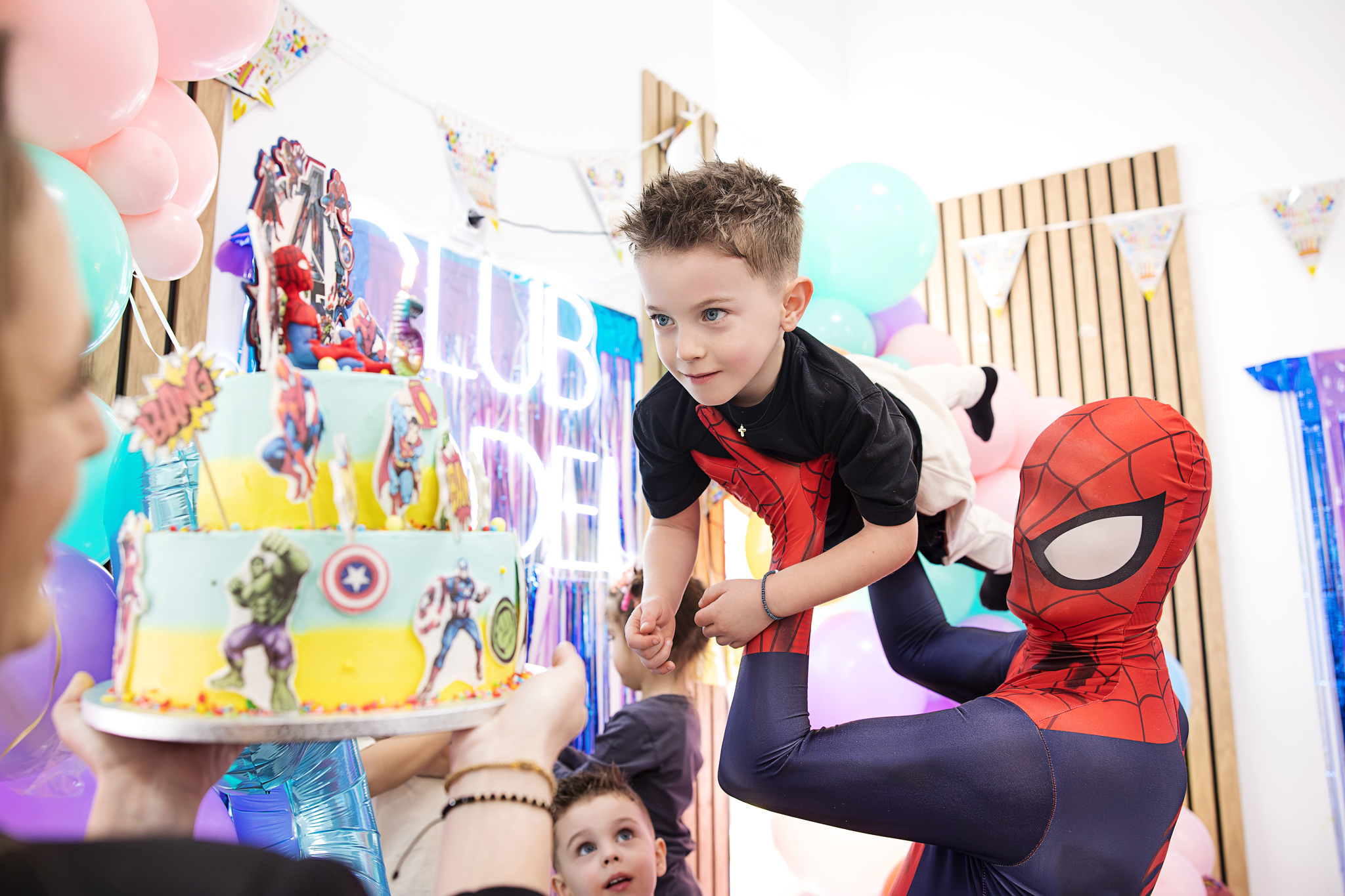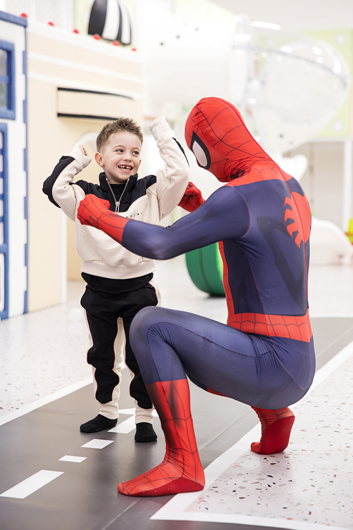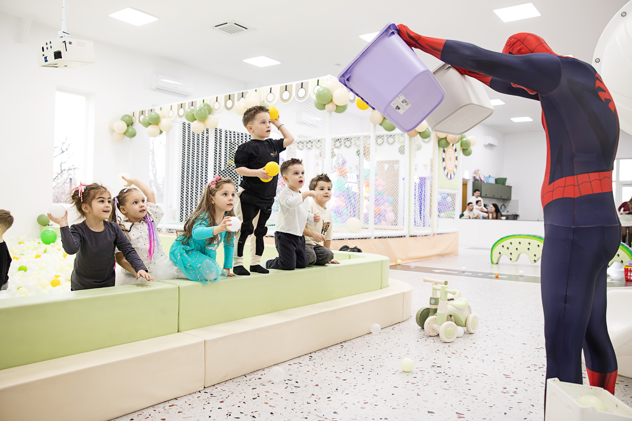 Animatorul Puiu Dan, costumat în Spider-Man, a știut să țină copiii conectați, implicați și relaxați. Iar când copiii sunt prinși în joc, apar cele mai bune cadre: râsete largi, expresii autentice, mișcare.