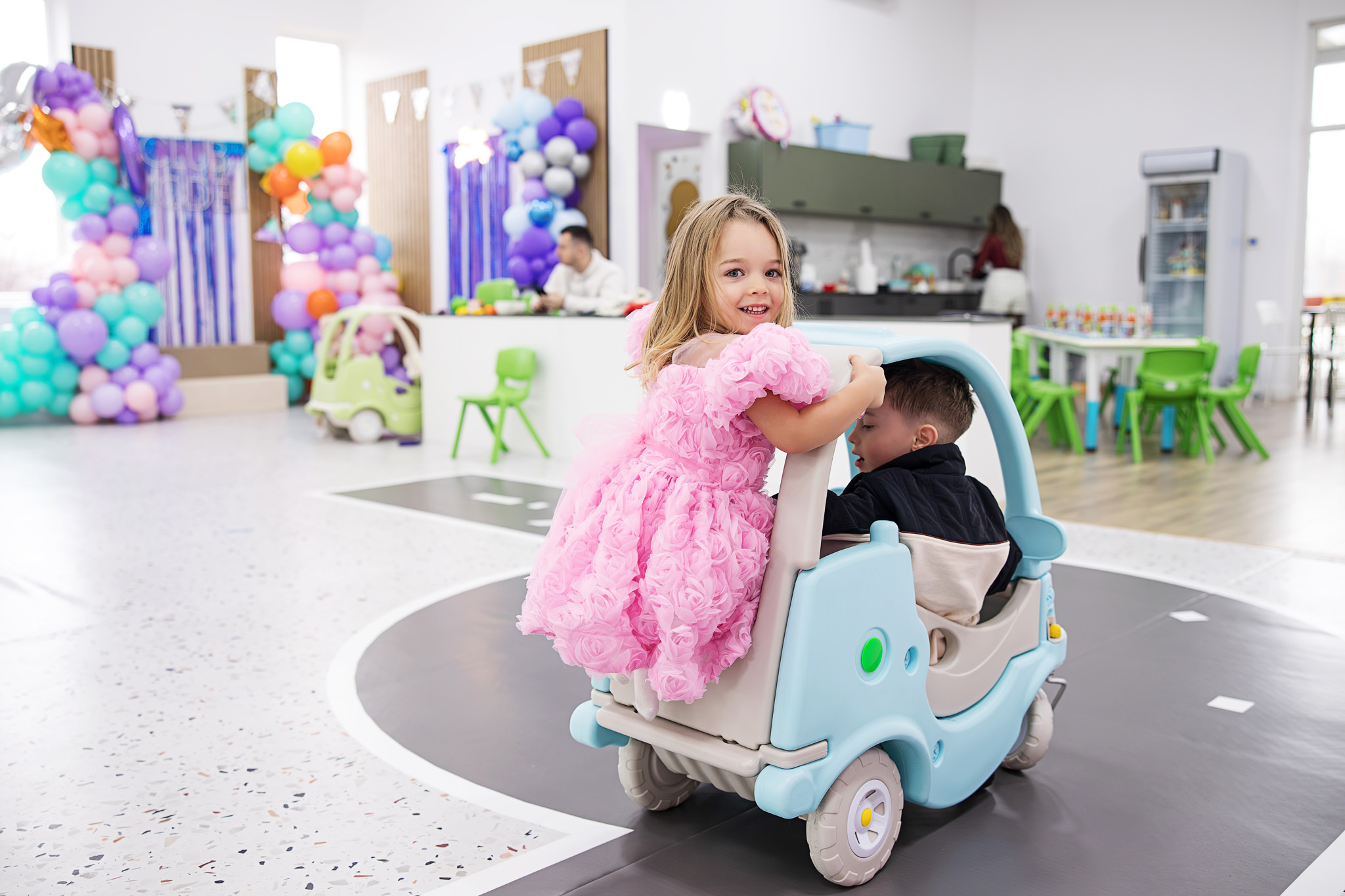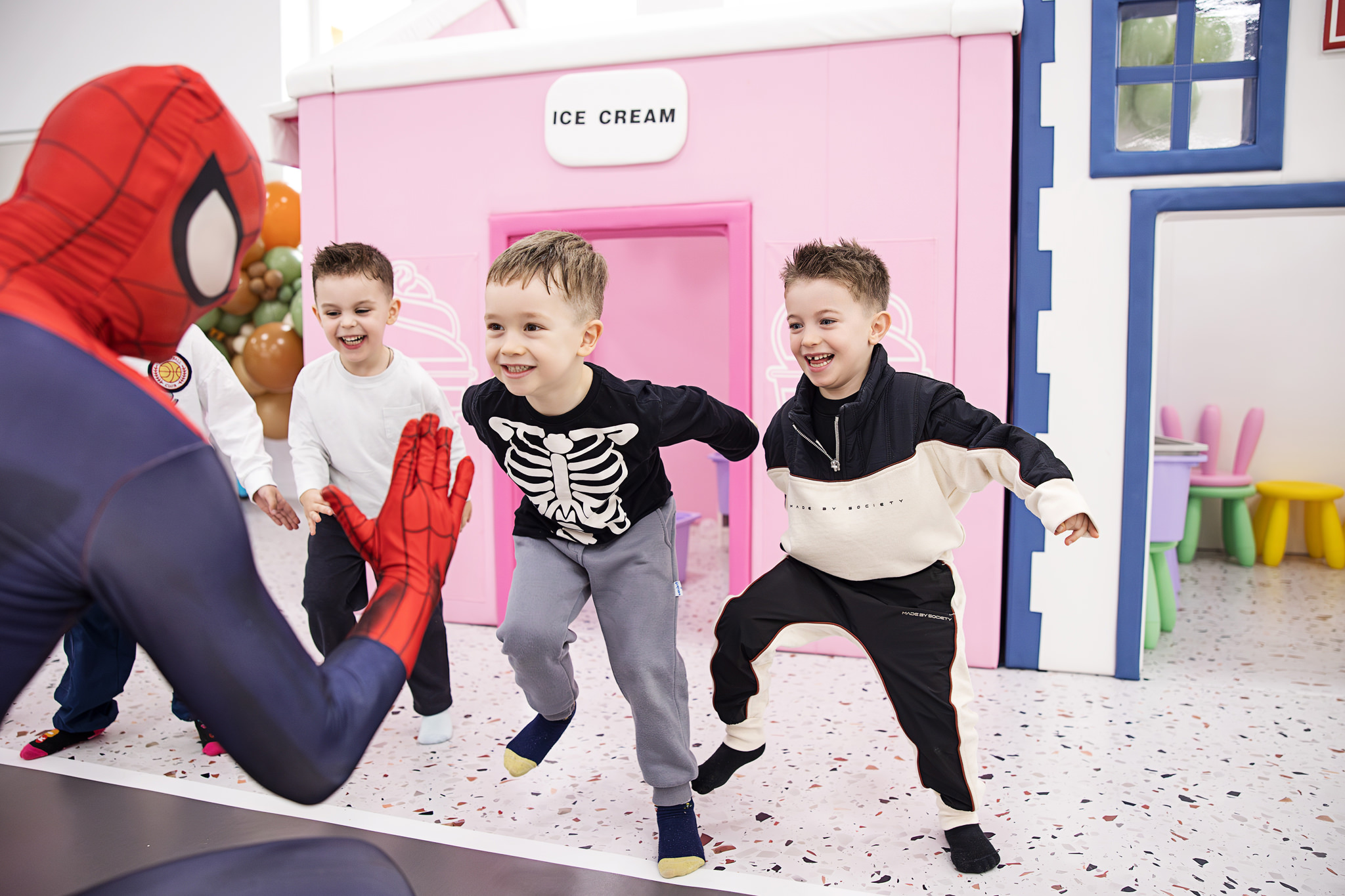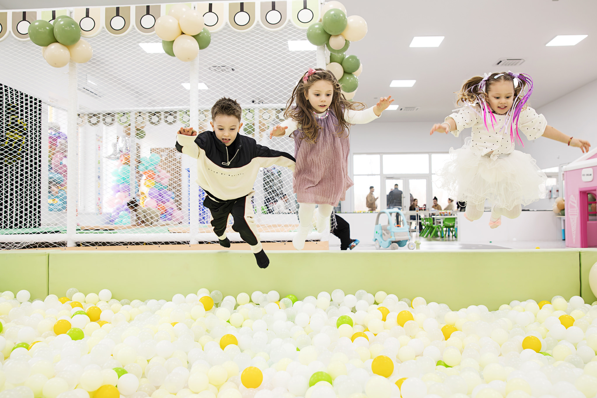 Podeaua moale, zonele largi și varietatea jocurilor le permit copiilor să se miște liber. Pentru mine, asta înseamnă fotografii naturale, fără zâmbete false sau cu copii „puși la poză”. Exact genul de imagini pe care părinții le caută atunci când își doresc un fotograf pentru petrecere aniversară copil.